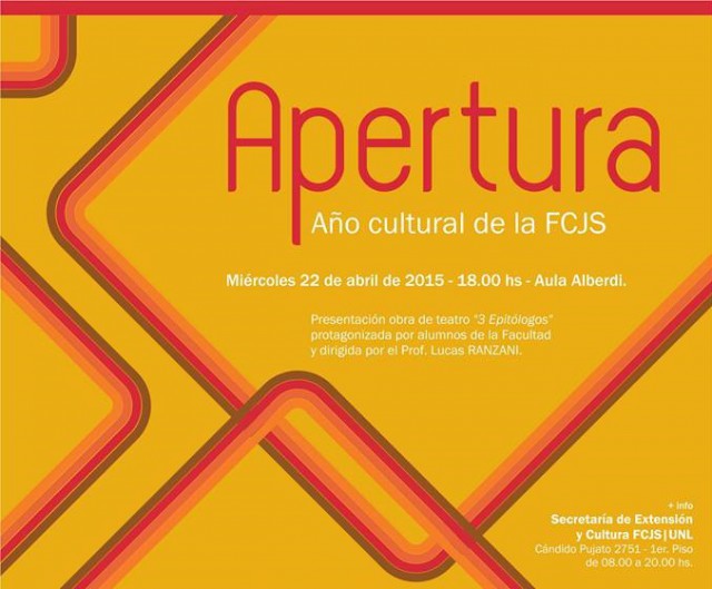 El miércoles 22 de abril de 2015 se realizará la Apertura del Año Cultural de la Facultad de Ciencias Jurídicas y Sociales (FCJS), con la presentación de la obra de teatro "3 epitólogos", protagonizada por alumnos del Taller de Teatro de la Facultad y dirigida por el Prof. Lucas Ranzani.