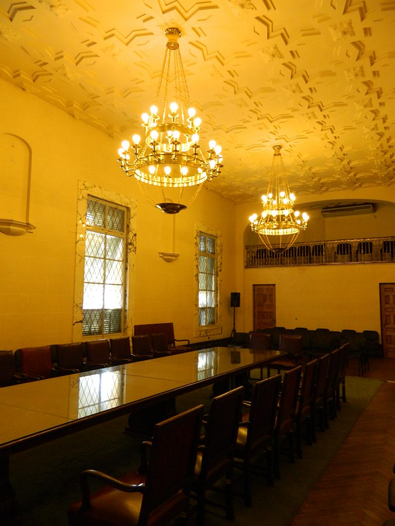 La sala del Consejo Directivo se encuentra ubicada en el eje compositivo del conjunto, dando cuenta del criterio de jerarquización de los ámbitos de los cuerpos de gobierno y los espacios de reunión y debate, dando cuenta de las ideas reformistas que también se encuentran en el Rectorado.