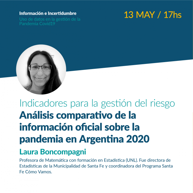 "Información e incertidumbre. Uso de datos en la gestión de la pandemia COVID-19” es el título del nuevo encuentro del ciclo “Comunicación y Gestión de Riesgos. Diálogos y desafíos ante la pandemia”. Se concretará de manera virtual el jueves 13 de mayo a las 17 y contará con la participación de Liliana Tauber, Javier Gómez, Gustavo Peretti y Laura Boncompagni.