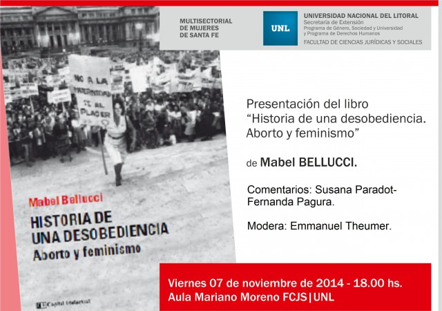 El Programa de Género, Sociedad y Universidad de la UNL, en co-organización con la Multisectorial de Mujeres de Santa Fe, invita a participar de la presentación del libro "Historia de una desobediencia. Aborto y feminismo", de Mabel Bellucci.